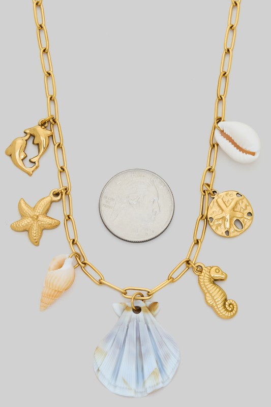 18K Gold Dipped Pearl And Shell Charm Necklace Please register or log in to view prices. Add a touch of elegance to your look with this stunning 18K gold dipped pearl and shell charm neckla…