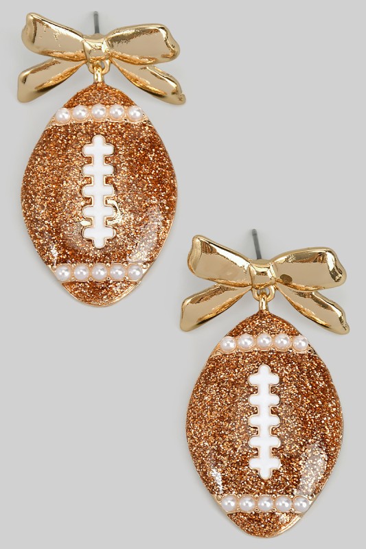 Lovely Bow Post Earrings With Dangling Football Please register or log in to view prices. Score big on style with these lovely bow post earrings, featuring a charming dangling football. Perf…