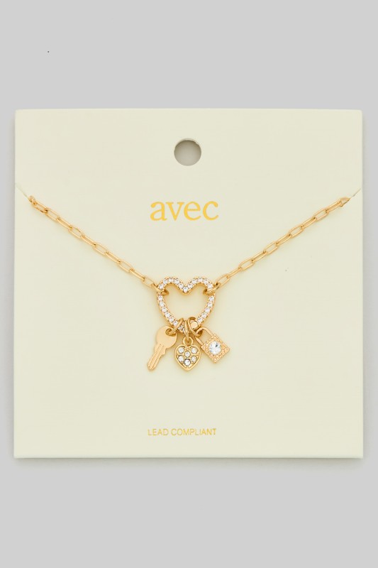 Cz Pave Lock Key And Puff Heart Charm Necklace Please register or log in to view prices. This charming necklace features a sparkling CZ pave lock, a delicate key, and a puff heart charm tha…