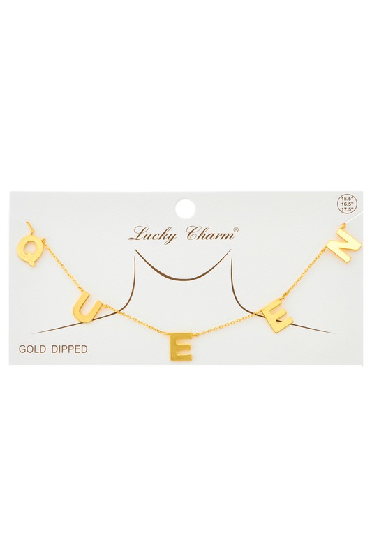 Queen Pendant Gold Dipped Necklace Please register or log in to view prices. Gold dipped, "Queen" pendant chain necklace. Approx. length "15.5+2".Units in Prepack: 2Price per un…