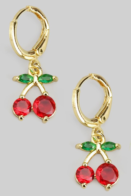 Lacquered Cherry Charm Huggies Please register or log in to view prices. Add a pop of color with these lacquered cherry charm huggies. Glossy red cherries dangle from polish…
