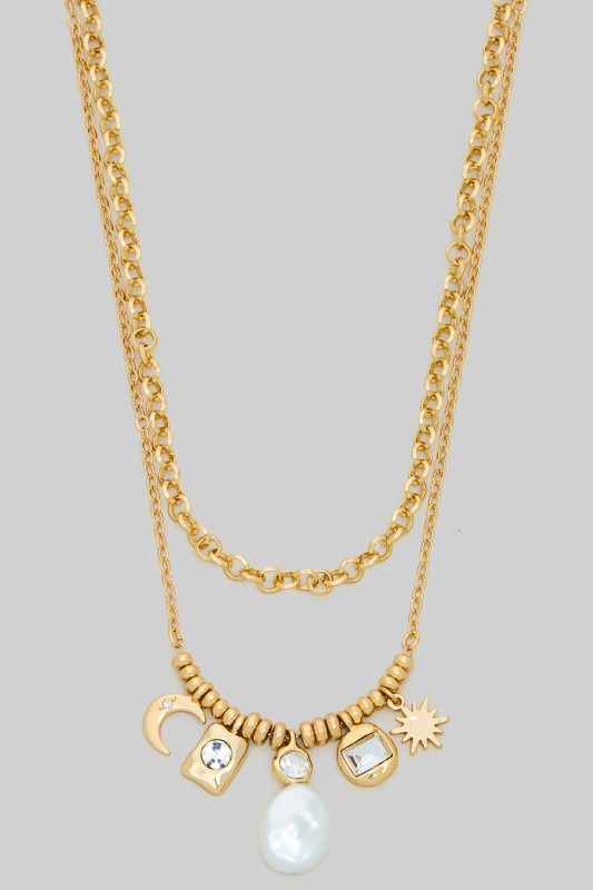 Layered Chain Multi Charm Necklace Please register or log in to view prices. Acrylic chain and seed bead layered necklace featuring flower, smiley face and Yin & Yang pendan…