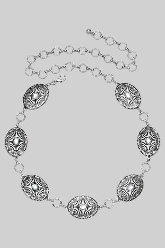 Western Concho Chain Belt - #KBT24062 Please register or log in to view prices. WESTERN CONCHO CHAIN BELT. LENGTH 25+19".Units in Prepack: 2Price per unit: $8.00