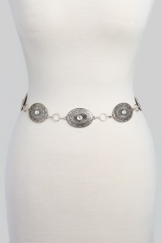 Western Concho Chain Belt - #KBT24062 Please register or log in to view prices. WESTERN CONCHO CHAIN BELT. LENGTH 25+19".Units in Prepack: 2Price per unit: $8.00