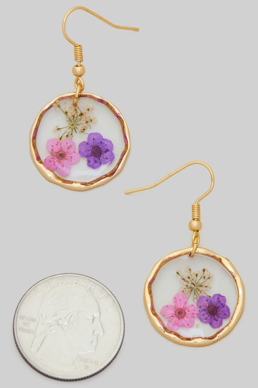 Multi Color Round Pressed Flower And Drop Earrings Please register or log in to view prices. Add a pop of nature inspired charm with these multi color round pressed flower drop earrings! At 1 5…