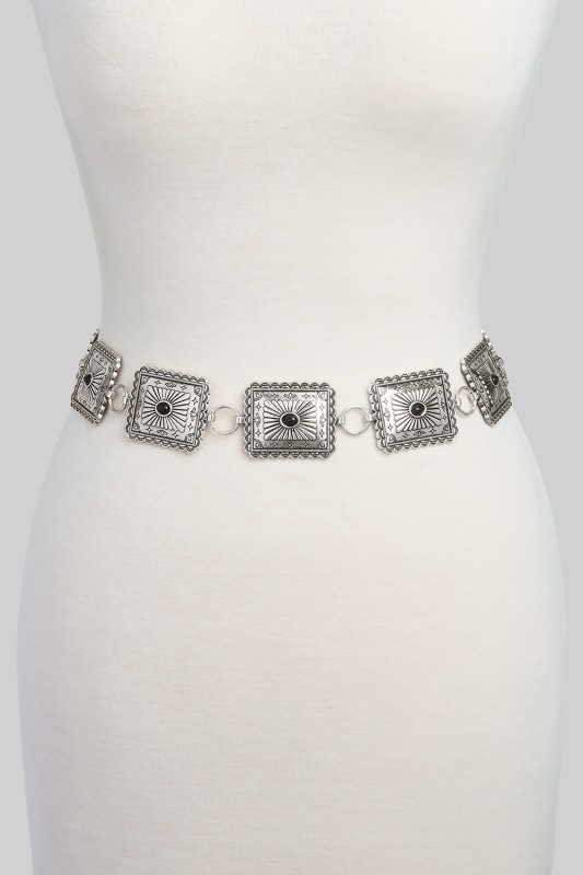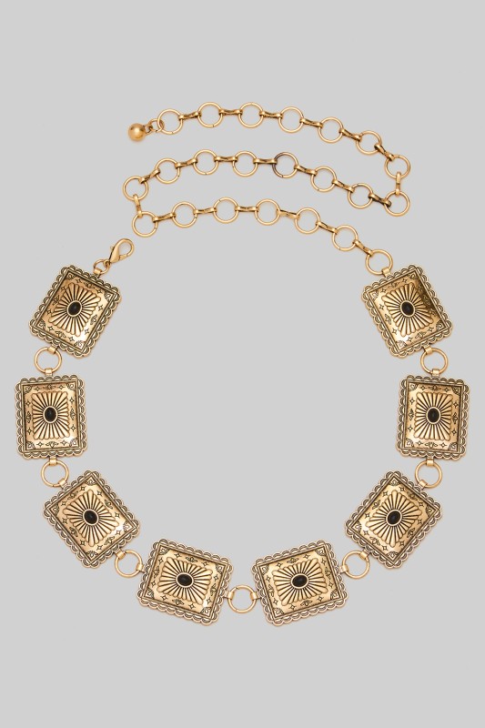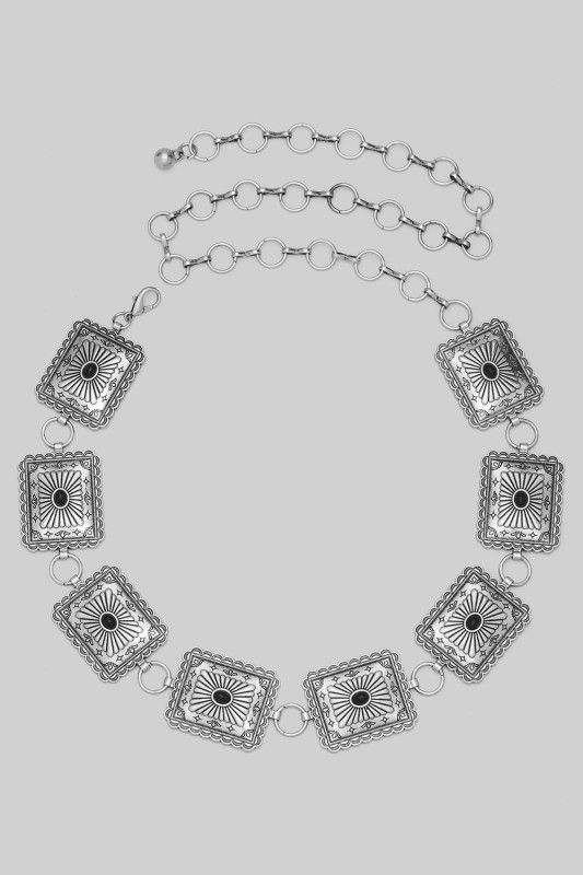 Stone Studded Rectangle Concho Chain Belt Please register or log in to view prices. Make a statement with this stone studded rectangle concho chain belt designed to elevate any outfit.…