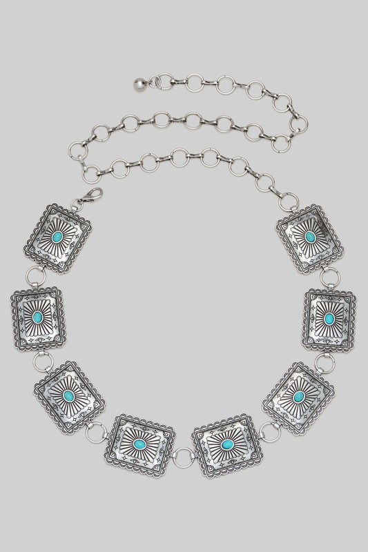Flower Link Chain Belt With Turquoise Stones Please register or log in to view prices. Add a pop of charm to your outfit with this flower link chain belt featuring bright turquoise stones…
