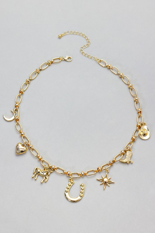 Horseshoe And Western Charm Chain Necklace Please register or log in to view prices. This chic horseshoe and western charm chain necklace is the perfect blend of rustic charm and stylis…