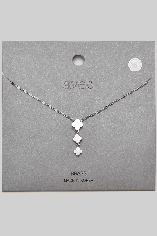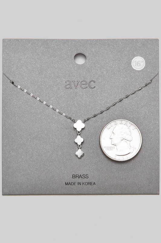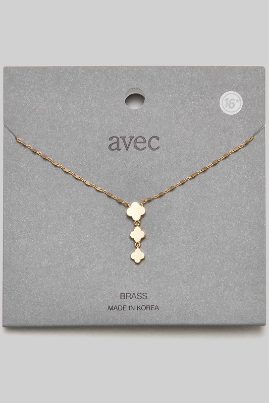 Three Clover Charm Necklace Please register or log in to view prices. THREE CLOVER CHARM NECKLACE. LENGTH 16+3".Units in Prepack: 2Price per unit: $3.50