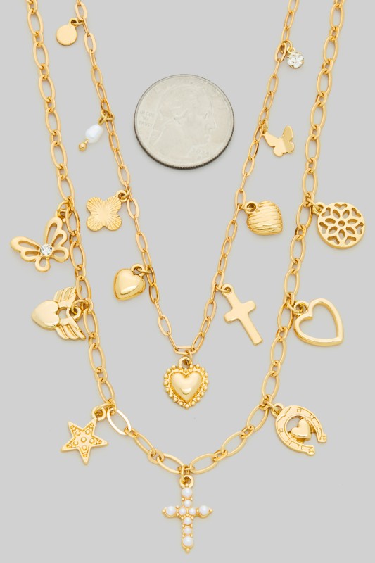 Layered Chain Necklace With Charms And Pearls Please register or log in to view prices. Add a touch of elegance and fun to your style with this layered chain necklace featuring sparkling c…