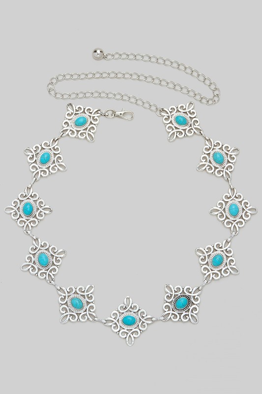 Concho Western Turquoise Stone Chain Belt Please register or log in to view prices. Elevate your style with this Concho Western Turquoise Stone Chain Belt. Featuring beautiful turquois…