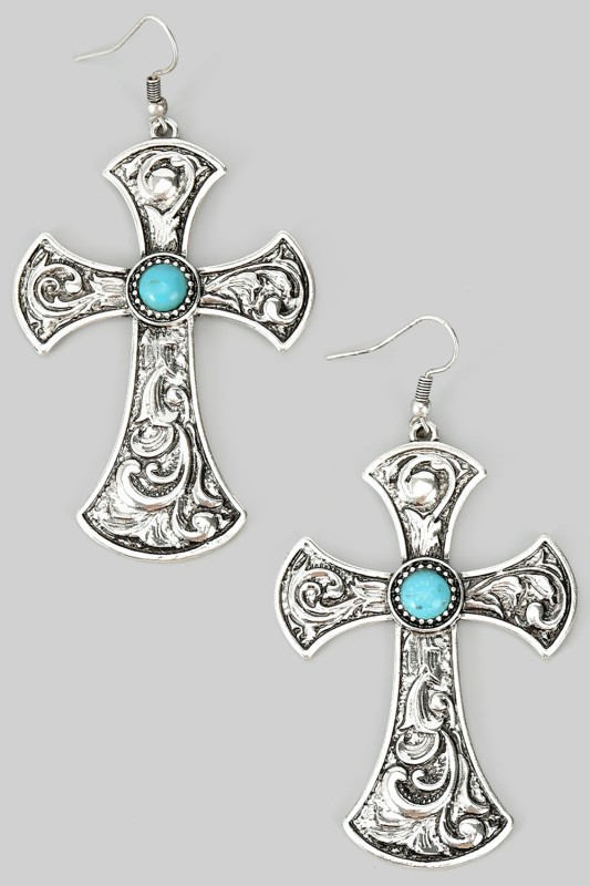 Turquoise Stone Beaded Cross Drop Earrings Please register or log in to view prices. Add a pop of color and charm to your look with these turquoise stone beaded cross drop earrings. Mea…